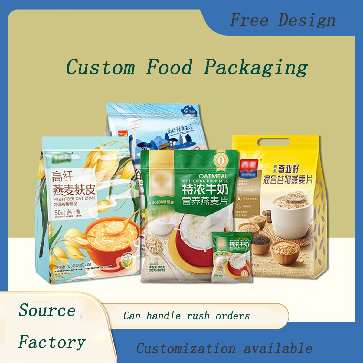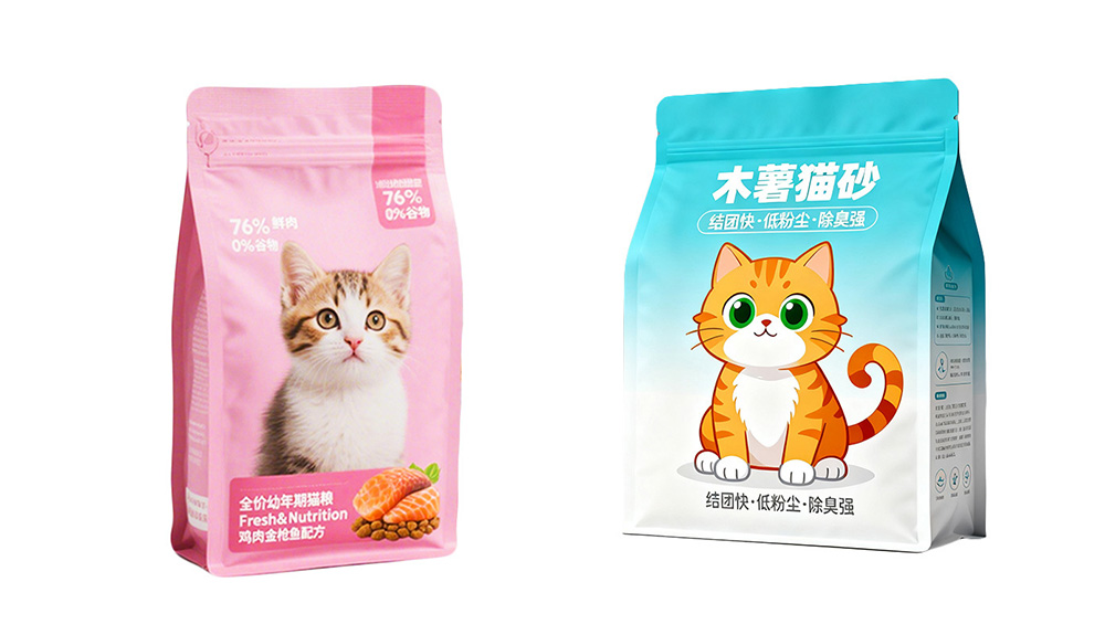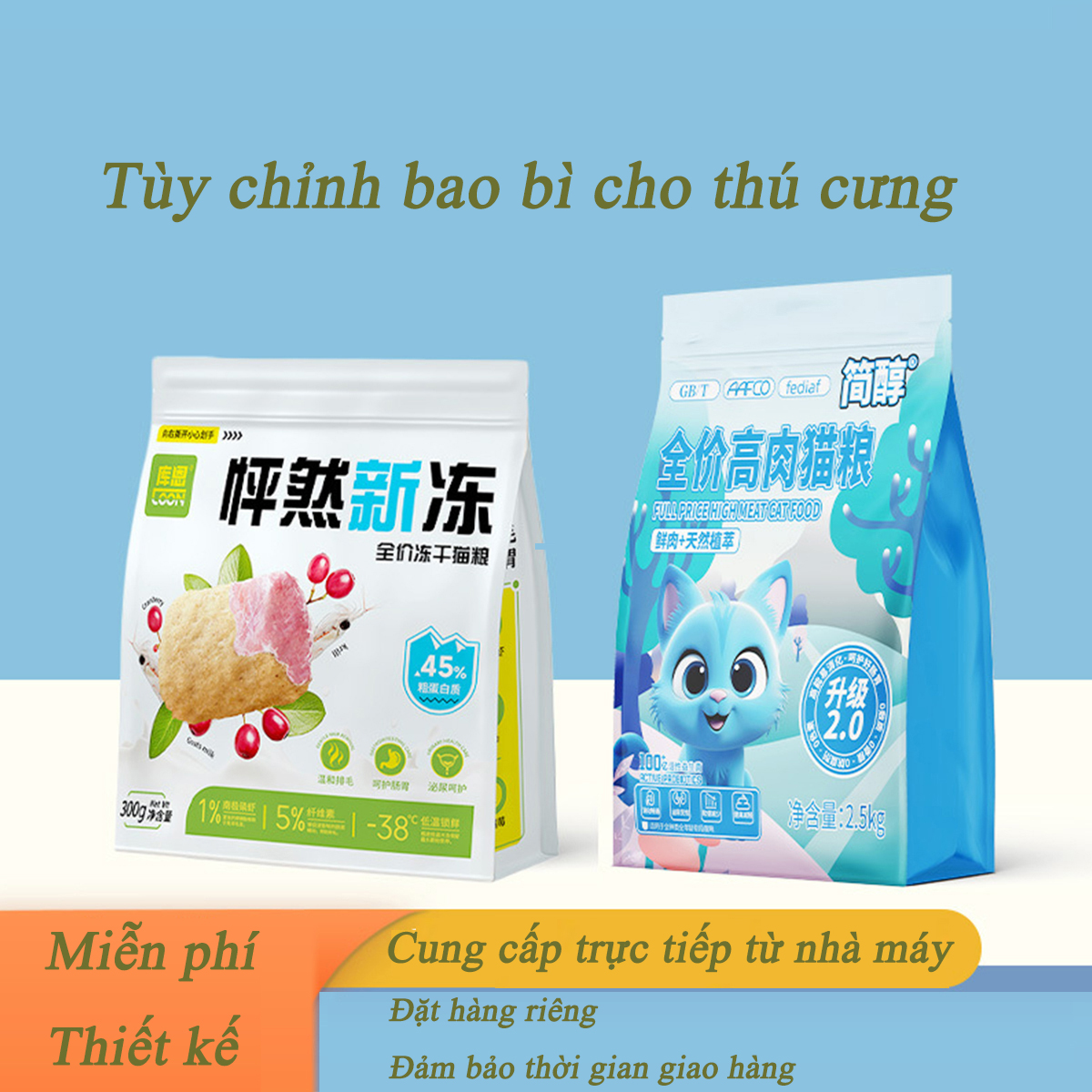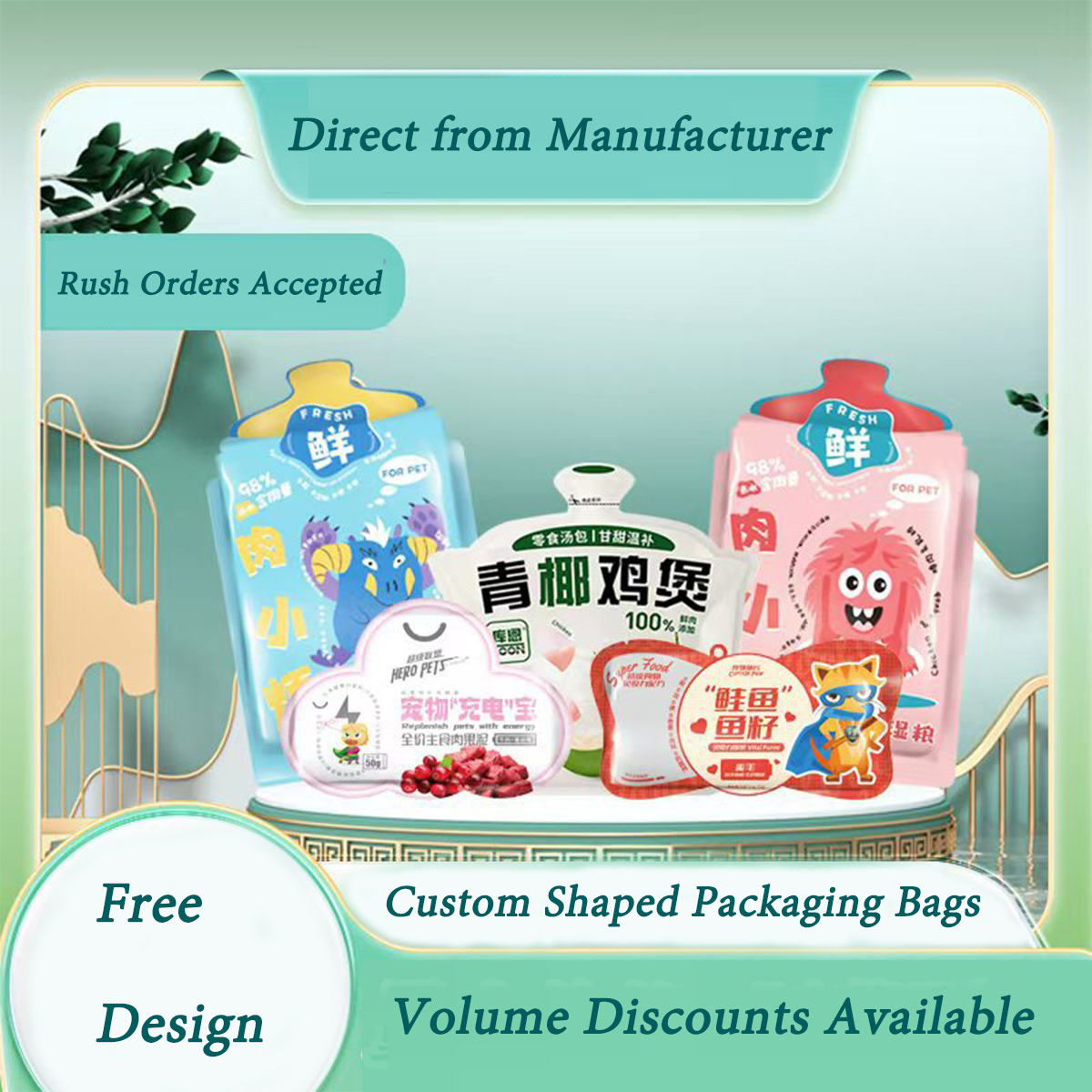 Stand-up pouches with a sturdy base for stable upright positioning. The pouch body can be printed with detailed information, making it suitable for snacks, pet food, laundry detergent, and more. Combines practicality with visual appeal.